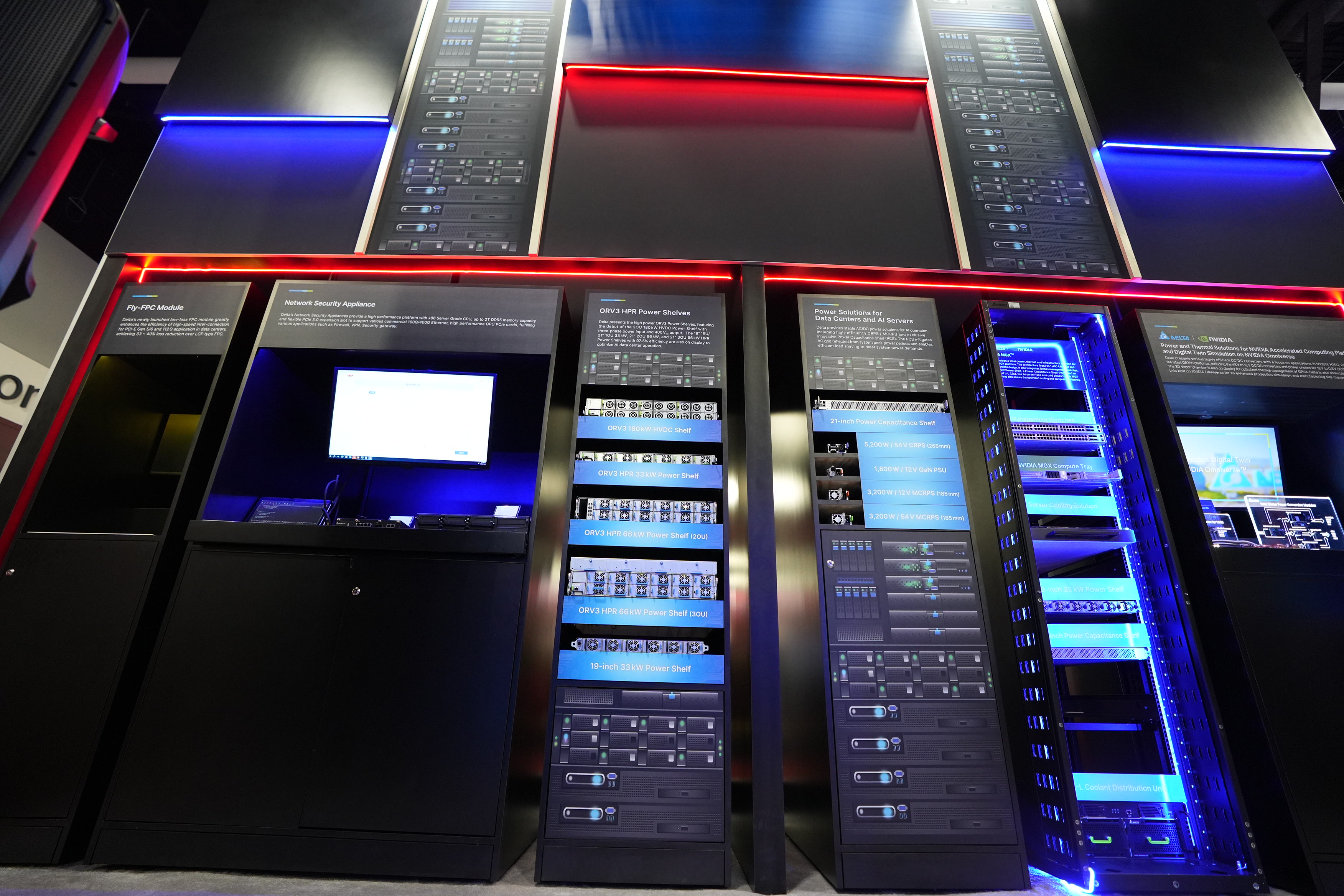 台達展示與NVIDIA合作的MGX機櫃,其中包括19吋機架式高功率電容,19吋33kW機架式電源,以及應用於板端的8kW直流電源分配板。
